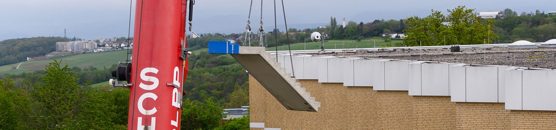 Über mehrere Stunden hinweg wurden die sechs Treppenelemente behutsam Stück für Stück um 20 Meter in die Höhe gezogen, über das bestehende Gebäude gehoben und passgenau in den Treppenschacht eingefügt. Präzision und höchste Konzentration aller Beteiligten waren dabei von entscheidender Bedeutung.